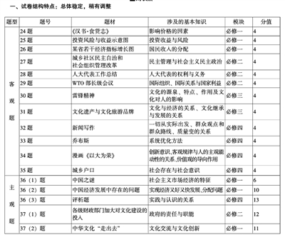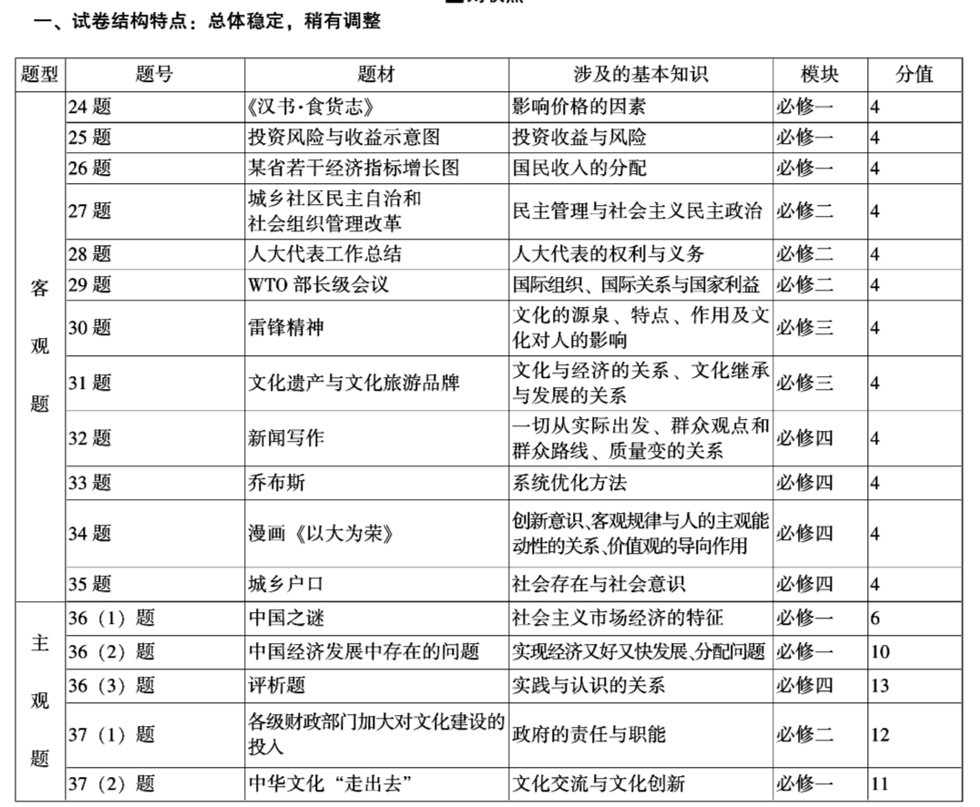 从表格可以看出,2012年的试卷结构、题型内容、呈现方式和阅读量都保持不变,依然采用了限定性与宽泛性设问相结合的方式,设置了古文、图形、图表、漫画等新形式,延续了“试题呈现形式较生动、涵盖内容较丰富、作答要求较平实”的广东试卷风格。而试题新变化主要表现在各模块的赋分比重调整上,《经济生活》《政治生活》《文化生活》和《生活与哲学》分别由原来的28分、23分、17分、32分变成了28分、24分、19分、29分,各部分内容比例、客观题与主观题的比例适当。同时,由于客观题中组合选择题的比例减少为6题,主观题设问的具体化和直观化,因而2012年的政治试题难度略低于2011年。