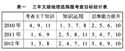 从统计结果来看,主干知识、知识运用、思维能力提升试题考核数量一直保持在3、4、4的比例,相对来说很稳定。主干知识是学科教学的基础,主要是地理概念的理解、地理要素的把握,是地理科目考查的第一阶段。知识运用主要考查学生的地理思维能力和智力,它是地理基础知识的延伸,学生需要运用相关的地理知识分析相关地理问题,学生既要了解相关地理知识,又要学会分析、运用这些地理知识,这是地理学科考查的第二阶段;思维能力则是考查学生多种能力的融合与创新意识,这些题甚至不需要联系地理知识,通过学生对图表的分析直接就可以获得,这是地理学科考查的第三阶段。这种三阶段的考查,有利于引导师生的地理学习回归教材而不迷信教材,重视基本概念、基础思维,重视能力提升。避免了乱猜题、靠题海战术来备考的错误做法,有利于中学的素质教育实施。