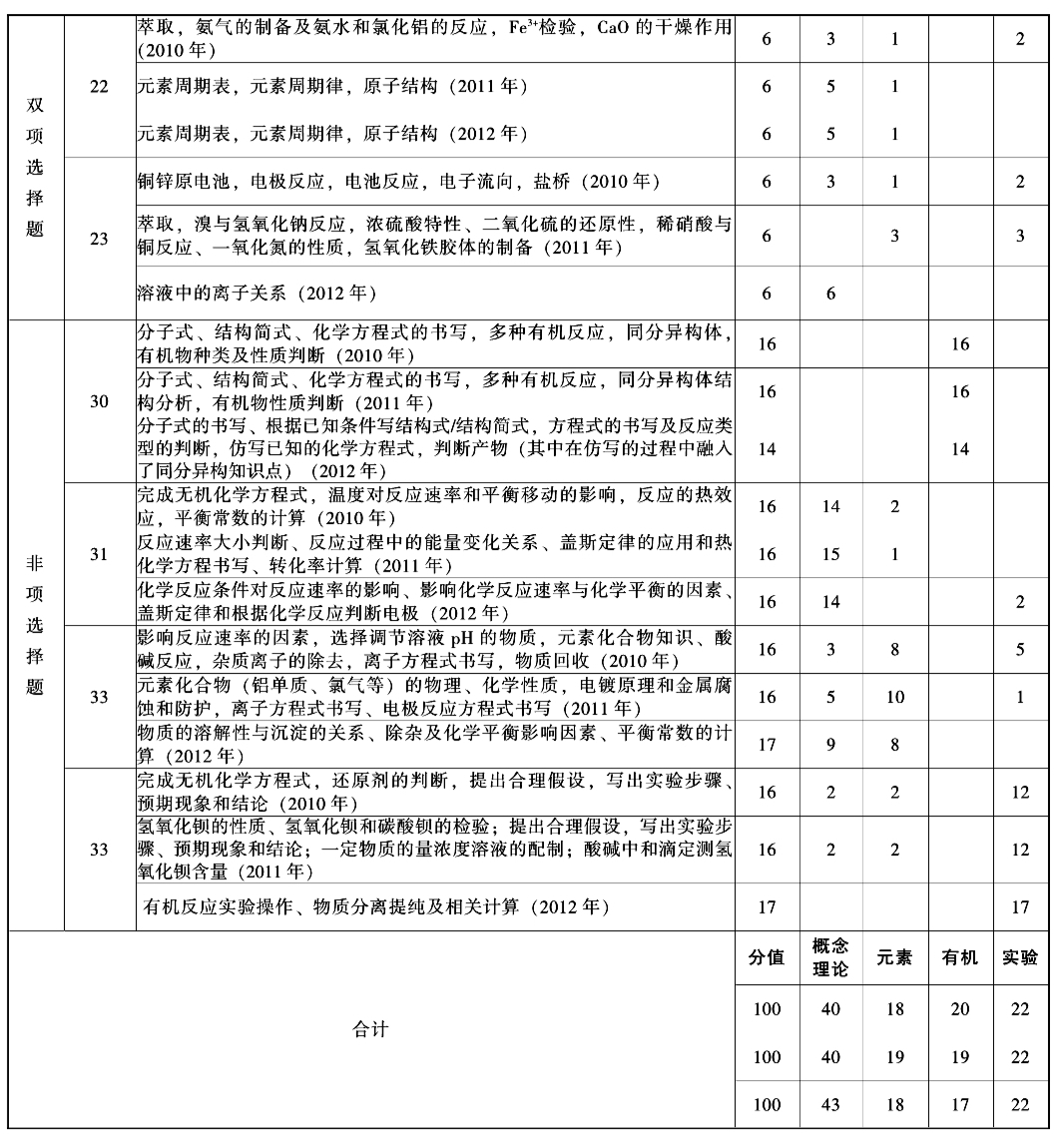表二数据显示近三年广东高考理综化学试题以能力立意为核心,注重知识与能力考查的融合统一。选择题注重对化学学科基础性知识的考查,主要考查考生的接受、吸收、整合化学信息的初级能力;非选择题注重理论知识在实践中的运用,特别注意情境与问题的设置,主要考查信息重组能力与化学实验探究及分析问题和解决问题的能力。高考化学试题主要考查了以下几方面内容: