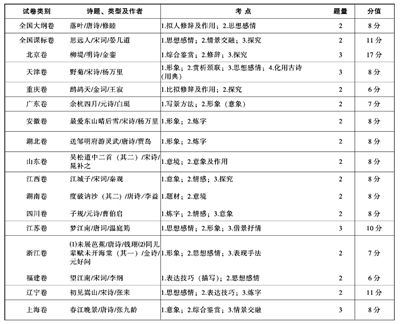 1. 诗歌品类。古代诗歌本应包括唐代以前的古诗、唐诗、宋诗、唐宋词、元曲、元明清诗歌。对照2012年17套语文试卷可知,高考命题所选诗歌主要集中在唐宋时期的诗作(含词),偶尔也选用金元诗歌,明清诗歌则轮流出现,唐代以前的古诗以及元曲今年没有选用(以前偶有选录)。这是因为,在文学史上,人们流传着这么一句话,叫“唐诗宋词元曲明