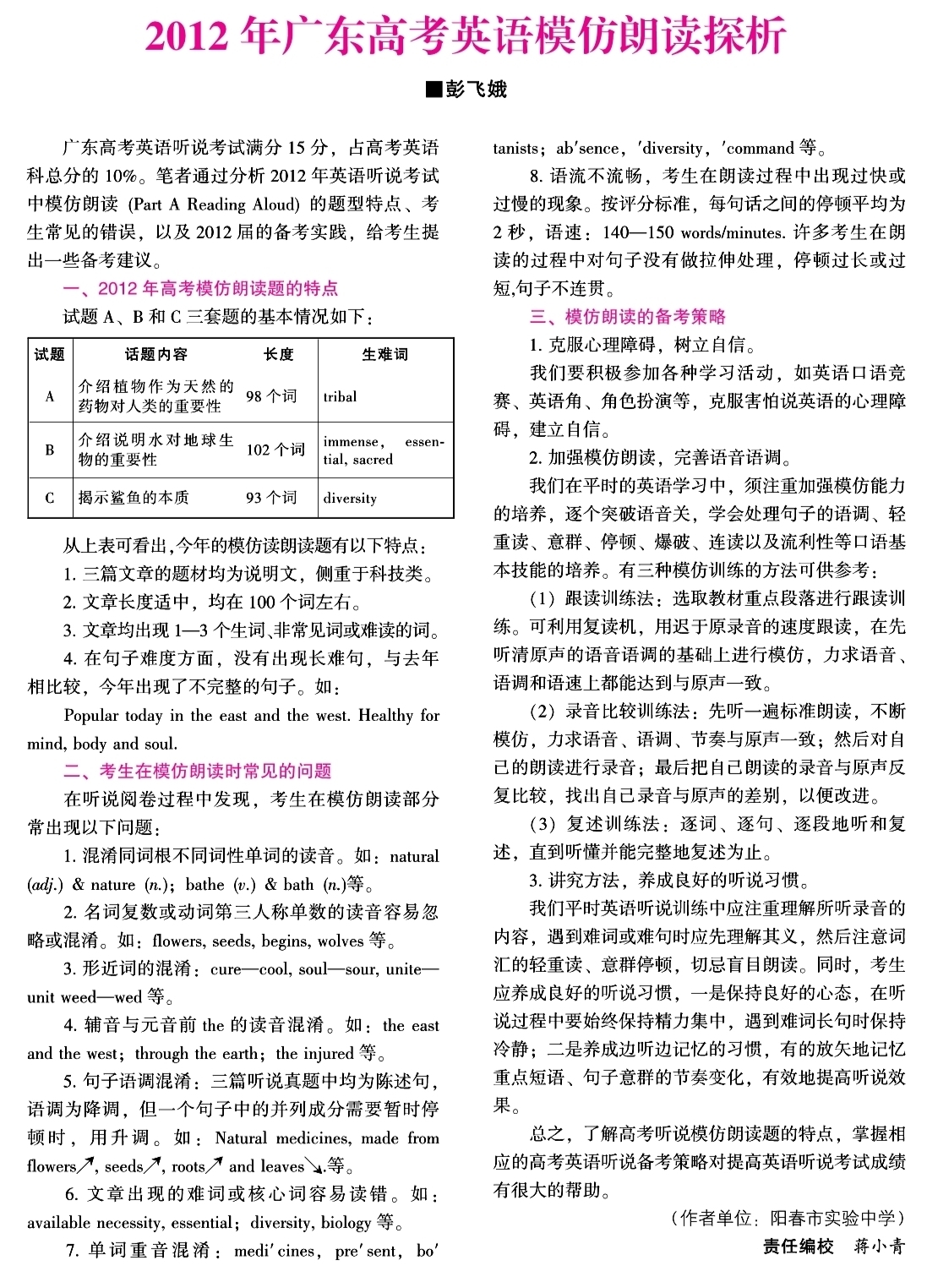 第088页:点拨·英语胜经·2012年广东高考英语模仿朗读探析