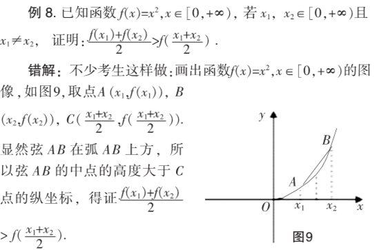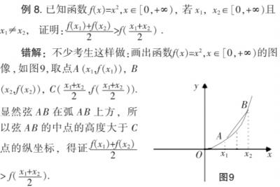 剖析:这里要证明的不等式,正是凹函数的定义,用凹函数的直观图形来证明不等式成立是一个逻辑循环,自己来证明自己.其实,用作差法即可证明.本题的定义域可改为全体实数也成立.