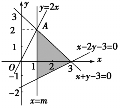 分析:(1)利用条件作出直线y=2x,x+y-3=0,x-2y-3=0.(2)由图形知,当直线x=m过点A(1,2)(即直线y=2x和x+y-3=0的交点)时满足条件.