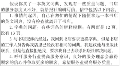 Last Wednesday I bought an English-Chinese dictionary in Youhao bookstore. Because I was in a hurry,I picked up a copy,paid for it and left the store without looking it over. The next day I found the notes under several word entries were illegible,and worse still, there were two page 12s but no page 13. Then I went back to the bookstore,asking for an exchange, but the shop assistant told me that there was no copy left in the store. Therefore,I requested him to contact the Publishing House to arrange a replacement for me, which was refused by the shop assistant,who asked me to do it myself. Something has to be changed in service trades since a strong service concept gives companies the opportunity to gain the customers’confidence and win more customers, so it is high time for those working in the lines changed their attitude toward customers and raise their awareness of service.