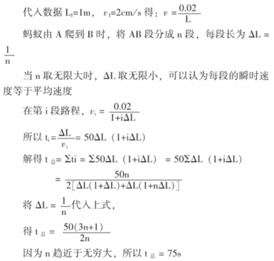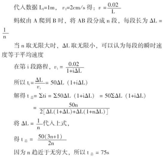 蚂蚁离开洞穴沿直线爬行,它的速度与到蚁穴中心的距离成反比,当蚂蚁爬到距穴中心L1=1m的A点处时,速度是v1=2cm/s.试求蚂蚁继续由A点爬到距穴中心2m的B点需要多长的时间?