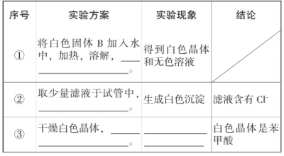 (3)测定白色固体B的熔点,发现其在115℃开始熔化,达到130℃时仍有少量不熔。该同学推测白色固体B是苯甲酸与KCl的混合物,设计了如下方案进行提纯和检验,实验结果表明推测正确。请在答题卡上完成表中内容。