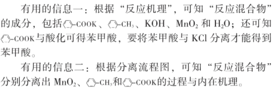 【解题思路】该题首先进入学生视线的是一组有机合成的信息,如果学生一味地沿着“合成”的思路往下想,就进入到了死胡同。有机合成的信息是为引出化工流程作铺垫的。因为用甲苯的氧化反应制备苯甲酸,从有机合成机理可知产物是混合物,需要经过一个化工流程过程才能实现分离。再看试题后面的问题,很容易明白本题命题的意图,那就是围绕“分离出苯甲酸”这条主线,考查学生实验、探究和计算等能力。围绕试题中的问题,能让我们很容易找到了有用的信息,并初步形成了解题的思路。