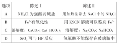 解析:加热法除去NaCl中的NH4Cl,是利用NH4Cl受热易分解的性质,与强酸弱碱盐没有关系,A选项不符合题意。用KSCN溶液可以鉴别Fe3+,是利用Fe3+与SCN-生成配合物呈红色,与Fe3+的氧化性无关,B选项不符合题意。相同温度下Na2CO3的溶解度大于NaHCO3,C选项错误。氢氟酸不能保存在玻璃瓶中,是由于HF能与玻璃中的SiO2反应。