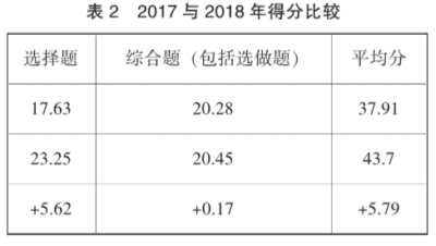 创新试题是每年高考命题者的追求。今年试卷在延续近年试卷整体风格的同时,试题的难易题分配、设问思路和综合性有所改变和创新。(1)从难易程度看,今年试题明显降低难度,不以偏、繁、怪的试题来区分考生,笔者在今年高考改卷前参与了试评卷工作,专家们也基本认为今年难度有所下降。根据广东省2017年和2018年的地理高考分数来看,今年整体平均分提高。其中主要是选择题难度降低不少,平均分增加5.56分之多。(见表2)