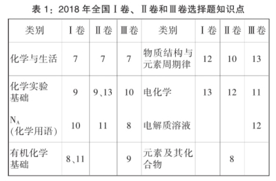 1. 通过表1选择题知识点分析得知,全国卷选择题主要考查化学史、化学与生活、化学实验基本方法、常见无机物的性质及应用、有机化学基础、原电池、电解质溶液中的离子平衡、物质结构及元素周期律等,实现了对高中化学核心知识点的考查覆盖,倾向于直接考查基础知识、基本原理、基本技能,难度普遍较小。今年选择题未出现化学史知识和电解质溶液的图像题,较大降低了选择题的难度。