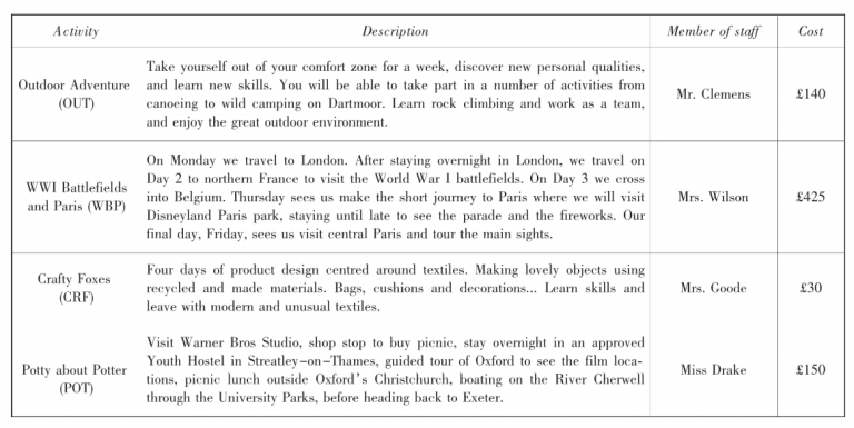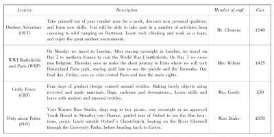 Students should read the list with their parents / carers, and select two activities they would like to do. Forms will be available in school and online for them to indicate their choices and return to school. Before choices are finalised, parents / careers will be asked to sign to confirm their child’s choices.