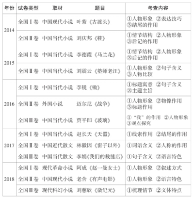 通过以下表格的综合比较,可以得出全国卷近几年在小说阅读这一考点上的几个特点: