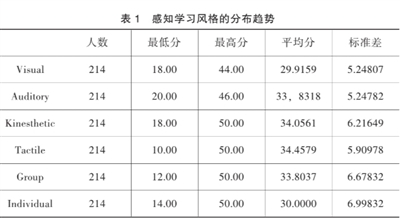 感知学习风格指的是学习者习惯性的利用一个或多个感官来理解、组织和保持自身体验。1987年,Reid对感知学习风格进行了细致的研究,并把学习者分为六种类型:视觉型、听觉型、动觉型、触觉型、独立型和合作型。他认为人们通过不同的感官进行学习,每个人都有自己偏爱的感官学习方式,语言学习者应该发挥感官优势,多感官多渠道的接手信息,这样才能有效地内化所学知识。在强调个性发展的今天,我们在教育教学中重视个体的学习风格显得尤其重要。笔者对中山市实验高中高二级的214名学生进行了感知学习风格的调查。