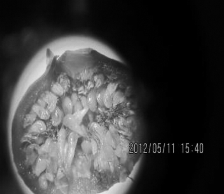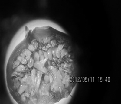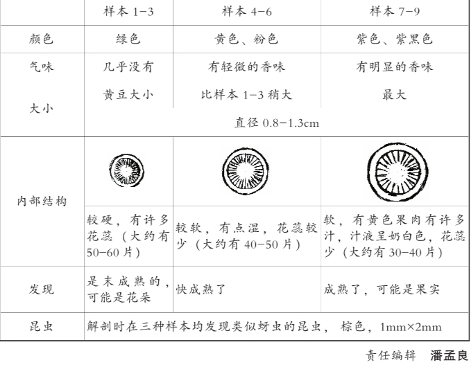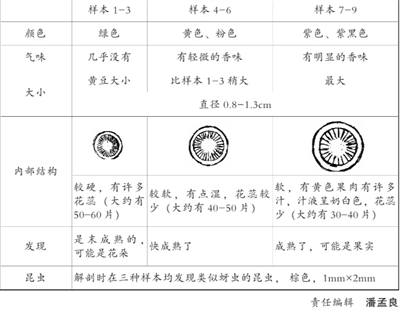 下面是一个学生的实验报告:在学校陶园内实地采摘到菩提榕树枝上的绿色、黄色、紫色三种不同色的球状研究样本各三颗。对这九颗样本解剖并借助2.5倍放大镜观察,记录如右表。