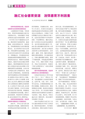 人的教育离不开家庭、学校和社会,单靠学校和家庭的力量不足以教育好学生,学校的德育工作链必须向社会进行有效的延伸。面对一些不利于青少年健康的社会环境,我们要的不是消极等待、被动堵截,而是要积极引导、协同净化。学校德育教育应与社区教育紧密结合,充分发挥社区在社会管理、矛盾处理等方面的职能,让社区成为更全面培养学生的重要途径。具体做法是:学校强化校内的思想政治教育和道德品质教育,丰富校园文化生活,增强学生抗诱惑的能力,提高学生的认识能力和辨别能力,同时积极取得社区的支持配合,依靠社区进行社会管理、矛盾调解处理等方面的职能,让社区参与净化社会育人环境的活动,促进社会育人环境的优化,从而更好地发挥学校德育的主导作用和调控作用。如我校07级15班学生王某扬、20班学生王某坤,行为散漫、态度恶劣、无心向学,政教处主动与南栅社区主管教育的王耀辉主任取得联系。王主任给予了极大支持,亲自到学生家里了解情况,针对学生家庭所存在的矛盾寻找对策,积极解决学生家庭教育存在的问题,取得了良好的效果,两名同学行为明显好转,成为合格的中学生,顺利毕业。