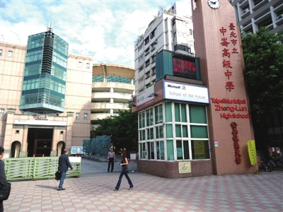 中仑高级中学位于台北市八德路四段101号,2002年正式成立及招生,校地总面积20573平方公尺,是台北市校地面积最小的高中,建筑面积75955.63平方公尺。校园建筑采取罗马式风格——大器、挑空而穿透。整个学校分圆心广场、教学区、活动中心及运动场四区,普通教室56间,专科教室14间,多功能教室7间。全校教职员共166人,教师平均年龄35岁,硕士以上占70%。谢校长的治校理念:前瞻宏观,真诚用心。他正是用此来正视未来中学的教师教学与学生学习变与不变的内涵。他希望三十年后中仑高中被外界定位为“让顾客感动的未来学校”。该校参加台湾教育当局100年教学卓越奖荣获高中职组银质奖,按我们的定义应该算是名牌优质高中。国中部学生约33人/班,每个年级8个班,升学公立高中职录取率65%以上。高中部学生约40人/班,每个年级10个班,升学国立大学录取率50%以上。