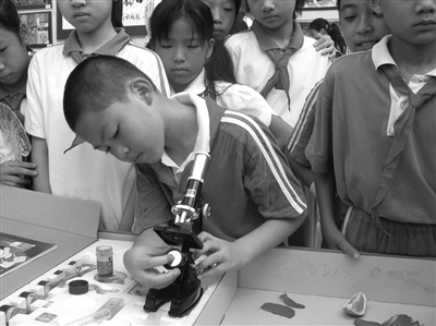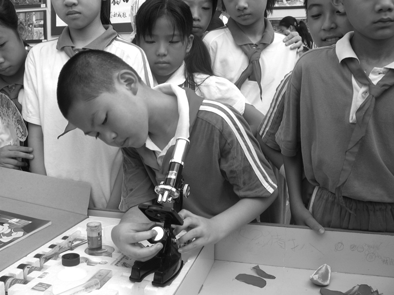 上课了,福田小学四年级2班的学生却都在超市里,50多个小学生一下子使得本来安静的小超市,热闹起来。有的拿起一袋饼干,翻来覆去的看着,有的拿着一瓶果汁,在本子上记录着,还有几个同学拿着一袋他们爱吃的辣条,在讨论着。他们是在买零食吗?不,他们是在上科学课,正在搜集食品包装上的信息;在学校的植物园里,几个学生手拿几片树叶,在比较它们有哪些不同的地方,还有几个学生在用铅笔把树叶的样子拓印在练习本上,有的学生在练习本上画他看到的大树;在学校的操场上学生用指南针辨别方向,在实验室里学生用显微镜观察各种细菌和微生物。这一幕幕场景都是福田小学科学课堂的掠影。“三动”策略让学生成为课堂的主体,让他们在课堂上神采飞扬。