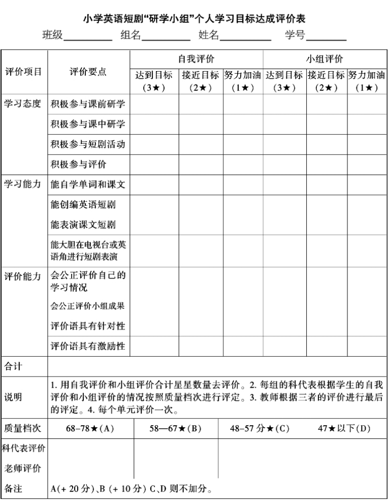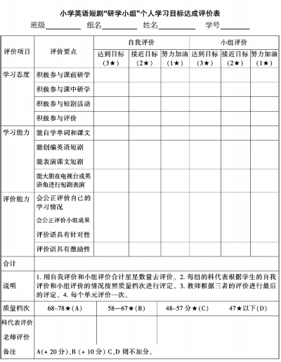 根据学生的短剧创编、表演水平,我们把学生的水平分成A、B、C、D四个级别。A类水平:能根据老师给出的任务独立编剧、组织同学排练、展示,剧本没有语法错误,剧情合理、表演投入符合角色要求、生动有趣、声音响亮。B类水平:能根据老师给出的任务独立编剧、组织同学排练、展示,剧本语法错误不多,剧情较合理、表演符合角色要求、生动有趣、声音响亮。C类水平:能基本上根据老师给出的任务独立编剧、组织同学排练、展示,剧本语法错误多,剧情不太合理、表演符合角色要求、生动有趣、声音响亮。D类水平:不能根据老师给出的任务独立编剧、组织同学排练、展示,剧本语法错误非常多,剧情不合理、表演不符合角色要求、声音较小。每个小组都由A、B、C、D类的学生组成。在活动的过程中,小组成员必须齐心协力,共同进退。A类同学必须辅导D类同学,B类同学必须辅导C类同学。如果该小组的C、D类同学通过辅导后,在老师的期末水平检测获得C、D类第一名,则该组每个同学都可以获得奖励分20分。