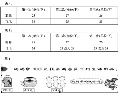 聪聪和飞飞两人跳绳比赛,每人跳三次,总数多的人赢,请估一估,谁输谁赢?(见表1)