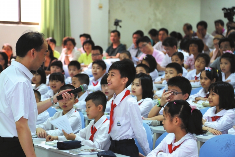 如今,无论是中心城区,还是城乡结合部,抑或农村学校,“上品教化”都已经通过独特的表现形式,聚合成全区独树一帜的品牌特色。市桥实验小学,地处市桥南区;番禺区新桥小学,偏居农村一隅。无论学校地域差别有多大,践行上品教化的具象有多么不同,但走进这两所学校,有一种感觉却是相同的:每一位教师都倾情倾力,每一个孩子都能享受同样的呵护!