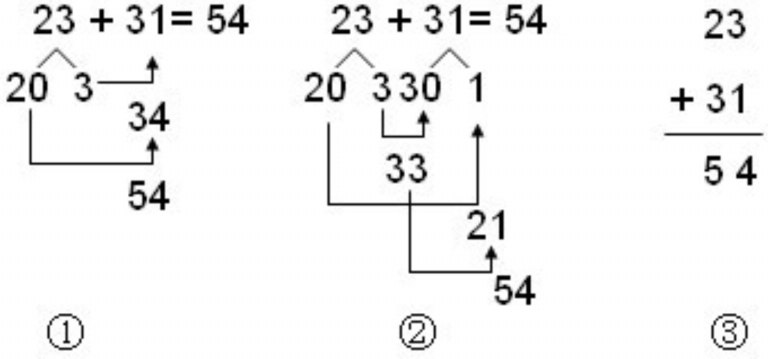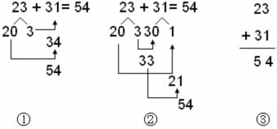 师:这位同学眼光非常敏锐。我们一起跟着他的思路来重新看看②和③。②中的3+1,就是③里面的个位加个位,②中的20+30,就是③里面的十位加十位。虽然它们长的不一样,但却是一伙的,实质都是相同数位上的数相加。