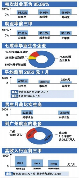 据介绍,在称为“史上最难就业季”的2013年,共计约70万高校毕业生在我省求职,初次就业率已达95.86%(其中研究生就业率为93.72%,本科生就业率为94.93%,专科生就业率为96.96%),与2012年同期就业率(94.65%)相比略有上升。我省高校就业指导服务水平显著提高,培训实现了专业化、专家化、职业化。在“华普亿方杯”首届全国高校创业指导课程教学大赛全国总决赛中,广东技术师范学院黄明睿老师获得特等奖,展示了我省高校创业指导课程建设和师资队伍建设的阶段性成果。此外,“春暖校园”系列招聘活动有力地搭建了学生与企业对接的平台,形成了“期期有专场,月月有市场,周周有招聘,天天有面试”的特色,为全国就业指导工作提供了新鲜经验。对贫困毕业生的帮扶工作也取得了一定成绩,如广东医学院推行了“1对2模式”,1位老师重点关注、推荐、服务2位毕业生,近5年内共帮扶了1300多名毕业生。