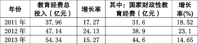 2011年至2013年,珠海全市财政性教育经费支出年均增长为18.8?%,高于同期财政支出年均14%的增幅,确保教育经费依法每年实现“三个增长”(见表格)。