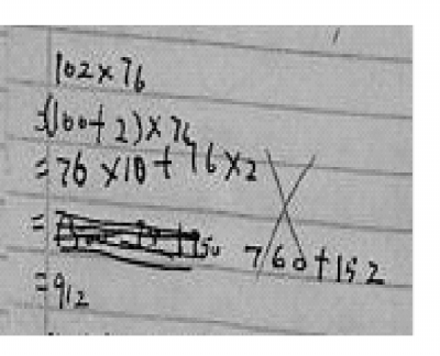 对于102X76,该学生能将102看作“100与2的和”,且能将两个数的和与一个因数相乘的形式展开写成两个数的积相加的形式,只是“100”变成了“10”。