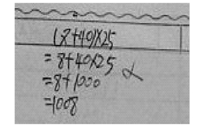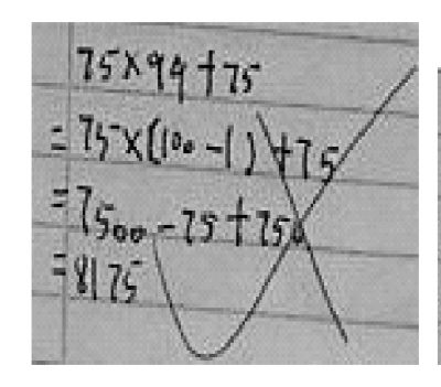 对于75X99十75,该学生也有凑整的意识,能将“75X99”看成75与100减1的差,而且展开也是正确的,但却没有从整体上理解算式的意义和看到隐藏的因数1。最后,又将75写成750,导致错误。