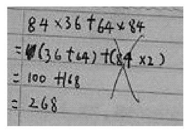 对于84X36十64X84,,可以看出该学生对乘法分配律的本质并没有理解到位,不能够逆向应用乘法分配律解决问题,虽然看到“两个”“84”,但是看到的是表面,而没有将它与“一个数分别乘以两个加数”联系起来。看来,学生对于这算式的意义没有真正理解。另一方面,学生的数感和估算的意识比较薄弱,否则会意识到这个结果是绝对错误的。