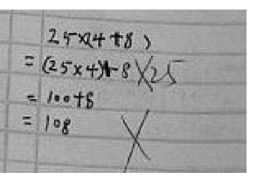 两位学生都是将靠近因数的那个加数与因数相乘,再与另一个相加。错误的原因在于学生对乘法分配律含义理解不透彻,没有建立清晰的认知图式,错误地理解算式中出现的是三个数,展开的算式也应该是三个数。辅导对策:一是通过情境的创设来让学生解决生活中可以用乘法分配律解决的的实际问题。例如不同的单价购买同样数量的物品的总价。二是让学生观察算式,对比两种算式的异同。三是让学生对两种结果进行比较。四是进行似是而非的判断。