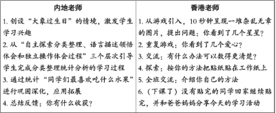 小学数学课堂文化是通过教师的教育智慧,创建、激发富有生命的、有效的数学课堂,从而形成一种开放、自由、和谐、智慧的、提升教师和学生生命质量的课堂文化,它将数学文化与课堂教学过程中所形成的价值观念和思想行为形成统一整合体。以下通过内地、香港两位教师执教的小学一年级《统计》课例,谈谈我对内地、香港小学数学课堂文化异同的一些看法。