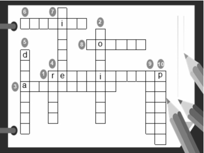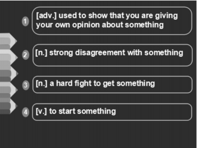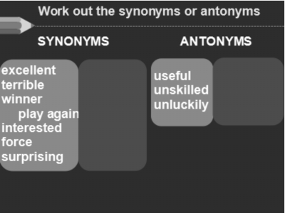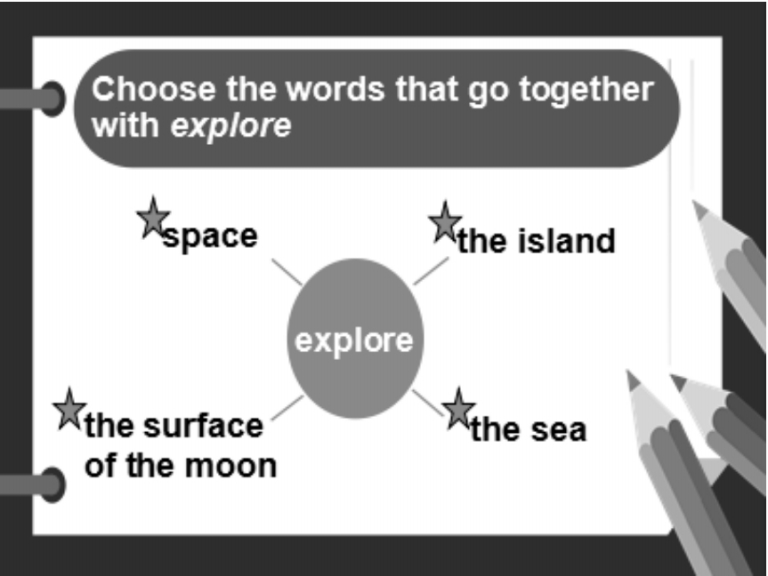 点评:邱老师根据复习的需要,分别从检测内容、检测形式以及检测的目标等三个方面,通过4个词汇游戏对单元词汇进行复习。图3:匹配练习;图4:拼字游戏(根据图5-6的解释找出拼字图里的单词游戏);图7:写出同义词、近义词;图8:拼字游戏。这4个词汇游戏中,词汇的复现形式有辨认型(再认)复现和回想型(再现)复现两种形式。其中,图3和图4所涉及的练习,属于辨认型检测,它只需要学生能够听出、认出相关词汇;而图7和图8所涉及的相关练习则为回想型检测,它要求学生能说出并写出该词汇,对学生的要求比较高。如此设计,由易到难,减少了学生的心理负担,也降低了学生对词汇检测的恐惧感,能帮助学生在理解词意的基础上更准确、更全面地掌握所学的词汇。而且,不断变换的要求,具有一定的趣味性,符合学生的学习心理并能够形成热烈的课堂气氛。