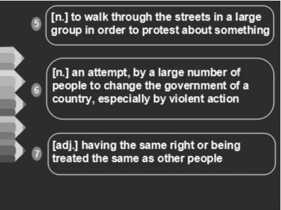 点评:从检测内容上看,词汇检测应该是全方位的。在单元词汇检测2这一环节里,便是把要检测的词汇均呈现在一定的语境里,让学生在抢答(图9至图25,共16题)的活动中帮助学生复习词汇的用法。每个组要通过答题来完成该组的拼图,拼图完成后,即能揭晓老师在上课前设下的悬念(如图26所示:hero)。这一环节,无论从检测内
