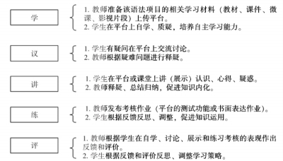 Claroline平台下的《高中英语语法》微课程学-议-讲-练-评教学模式的基本流程图: