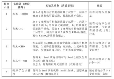 经过小组讨论,学生们认为该有机物的饱和度为1,所以该分子只含一个双键,也就是说该分子只含有一个—COOH或一个—CHO或一个C=C或一个— CO—或一个—COO—或一个环或R-O-R,其它碳原子都是饱和的。接下来进入设计实验方案,并进行实验验证。