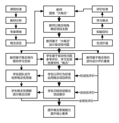 教学的设计方法和设计思路决定着教学成效。C-PBL以培养学生概念性思维能力、概念理解能力和运用能力作为设计项目式学习的出发点,以概念内化和概念迁移为目的逆向设计评价量表和引导项目研究,以概念性视角设计项目,将学生概念化思维能力的培养贯穿整个项目教学过程,达成提升学生核心素养的教学目标。设计方法见下图。