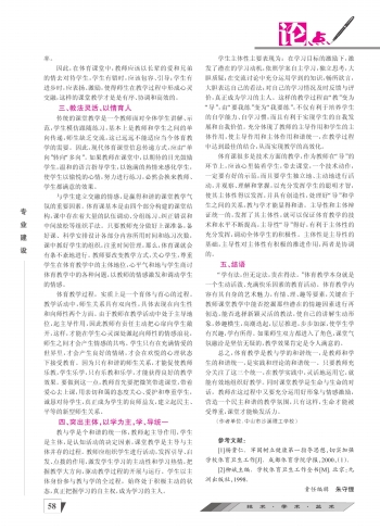 体育教学过程,实质上是一个育体与育心的过程。教学活动中,师生关系具有双向性,具体表现在向生性和向师性两个方面。由于教师在教学活动中处于主导地位,起主导作用,因此教师有责任主动把心扉向学生敞开,这样,才能在学生心灵深处激起向师性的情感浪花,师生之间才会产生情感的共鸣。学生只有在充满情爱的世界里,才会产生良好的情绪,才会在欢悦的心理状态下接受教育。因为只有和谐的师生关系,才能促使教师乐教,学生乐学,只有乐教和乐学,才能获得良好的教学效果。要做到这一点,教师首先要把微笑带进课堂,带着爱心去上课,用亲切和蔼的态度关心、爱护和尊重学生,诚恳对待学生,真正成为学生的良师益友,建立起民主、平等的新型师生关系。