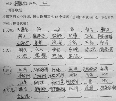 词语联想需要教师事先设计好领词,按照教育专家王晓春老师的指导思想,对学生给定5-6个“领词”,让学生在每个领词后面联想19个词,一组20个词。联想词的数目可增可减,学生想不出那么多,可以少写几个,教师要鼓励学生不要怕写错字,可用拼音或别字代替,想到什么就写什么。另外领词的设计可以涉及面广一些,有自然界的、社会的、动态的、静态的,有实词、有虚词、有心理状态等。通过了解一个人头脑的词汇储备情况,可以了解这个人,尤其是智力情况。科学研究表明,人的智力与他掌握的词汇量呈现正比关系,这种检测可以一年做一次,观察学生的成长变化。