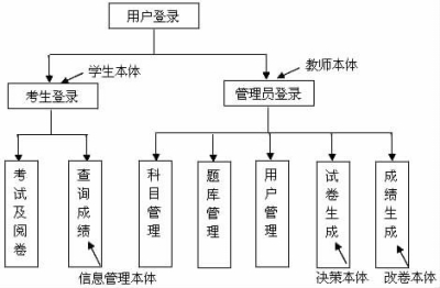 考生登录模块主要由学生本体、教师本体、信息管理本体完成,学生本体首先执行测试请求事件,该事件发送给教师本体;教师本体响应学生本体的测试请求后,学生本体执行进行测试事件,该事件发送给学生本体本身,学生开始测试;当学生完成测试后,学生本体执行测试完成事件,该事件发送给教师本体,学生完成测试。学生本体执行信息查询请求事件,该事件发送给信“网络测试系统”功能模块图
