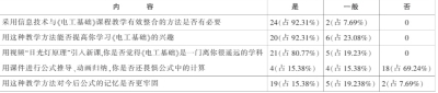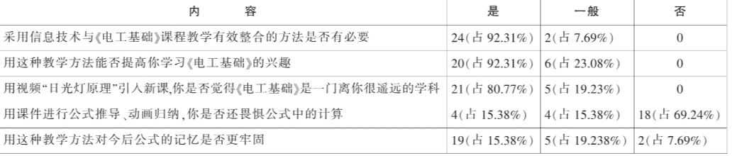 笔者在试验班对学生进行了问卷调查,对在“RL串联正弦交流电路”课程实践用“信息技术与《电工基础》课程教学有效整合”的情况做了调查统计,发出调查表30份,收回26份,采用无记名的方式。调查的内容和具体项目及统计结果如下表。