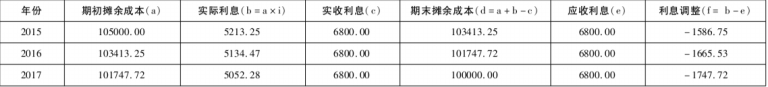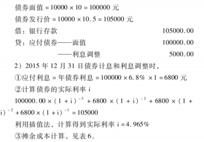 例3 广东米勒科技有限公司为购建一条衬衫生产线,2015年1月1日发行债券10000份,每份面值10元,每份发行价格10.5元,债券发行款已收存银行,该债券的期限为3年,票面年利率为6.8%,于每年年末支付本年度债券利息,本金到期一次性偿还。2015年12月31日该生产线建成并达到预定可使用状态。米勒公司账务处理如下: