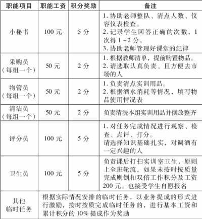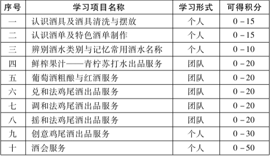 学习项目的有效实施是本课程实施激励教学的主要目标,但是日常教学管理也是课堂教学的重要组成部分。中职《调酒》课程日常教学管理工作主要包括:考勤、仪容仪表检查、纪律管理、物资采购、物品管理、作品评分、分数登记、回答问题、打扫卫生等。为了教学过程的有序进行,笔者引入“绩效激励制度”,把职业情景模拟下的激励教学不仅仅围绕学习项目,而是涵盖全课堂,学生一言一行均成为激励的对象。