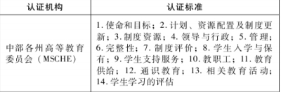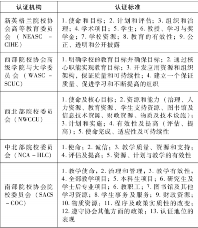 总体来看,六所高等教育认证机构的认证标准主要集中在四个方面:教育目标、教育资源、教育措施和教育效果。其中教育目标主要包括学校的使命和目标;教育资源包括促进学生发展和学校提高的人、财、物、技术等各种条件;教育措施指为保证教育使命和目标实现而采取的制度和政策等,如:领导与治理、组织机构、教育教学计划、教学项目、政策及程序、制度、评估等;教育效果是指教育目标和使命的达成情况,包括学生学习的评估、使命完成、适应性及可持续性、资源、计划与教学的有效性、认证地位的表现等。