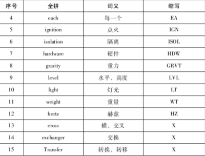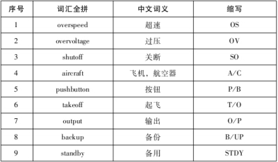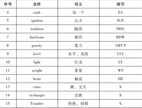 在普通英语中,有些单词或者词组反复多次出现,人们称之为高频词汇。这些词汇常常作为重点记忆和了解的对象。同样,在各类飞机维修手册、培训手册的使用和飞机机电专业英语的教学过程中,大量单词和词组反复出现,我们把这样的词汇叫做“高频专业单词”。这些高频专业单词要么出现在手册和教材文字当中,要么出现在图例之上,为了体现图例的简洁明了、一目了然的特性,科技工作者往往对这些进行缩略处理。词组词汇的缩略在前一节已经介绍,本节将主要介绍单词的缩略规律。典型缩略类型举例于如表3: