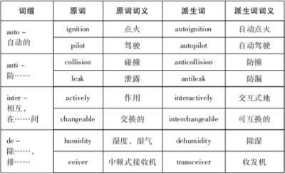派生法又叫词缀法,就是在各种词根的基础上增加不同的前缀、后缀构成一个新词。派生法主要是使词性发生变化,词根的词义仍保持不变。其特点是词义广泛、构词力强、结合灵活等。因此,许多飞机机电英语的专业术语来源于派生法。飞机机电专业英语中的主要派生词的归类如表4: