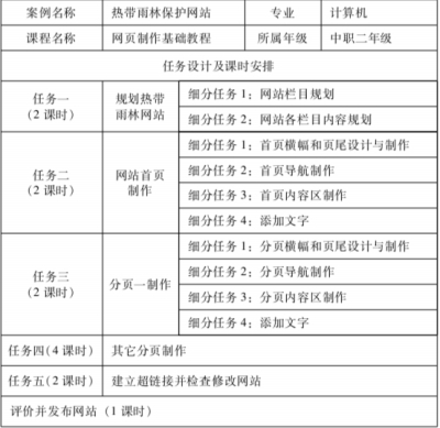 精选案例后教师要根据学生对知识和技能的掌握情况和教材的特点进行任务细化的设计,设计要尽可能考虑到实施的可行性和科学性,如笔者设计的《热带雨林保护网站》任务细分如下: