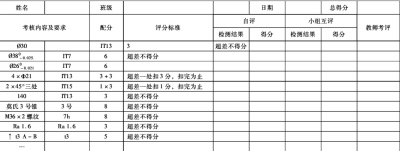 5.检查。学生依据机加工工件评分表(见表4),自行检查尺寸与形位公差,并逐项填写检查单。帮助学生使用量具测量零件的几何尺寸和形位公差,并记录。