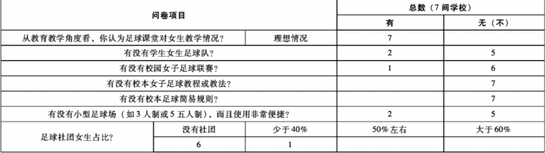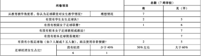 随机向我市兄弟学校体育科组办公室电话咨询或发放调查问卷总共7间,答卷7间,有效的答卷率为100%。也针对目前中职校园开展的足球活动项目中职女生对足球学习态度及平时踢足球锻炼时间发放问卷调查。在不同年级随机抽查,共发问卷145份(各年级一个班),回收率99.3%,然后进行归类统计。并以此为基础走访了一些一线资深的足球专项教师了解相关的情况。