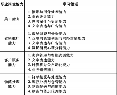 经过岗位任务分析,总结网店运营课程对应岗位群主要有四大工作能力:美工能力、营销推广能力、客户服务能力、物流处理能力。通过对四大能力分析细化,转化为相应学习领域,具体转化如表2所示。